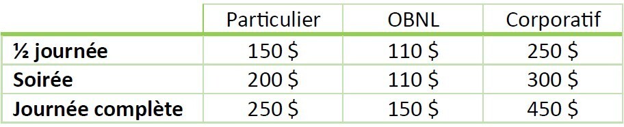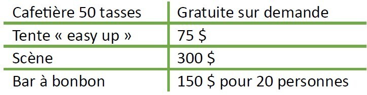 Les montants ci-dessous incluent uniquement la location de salle ainsi que les équipements indiqués, si applicable.