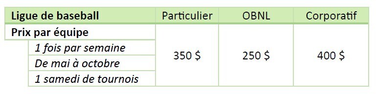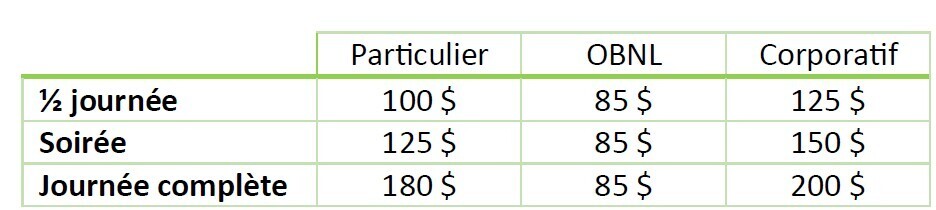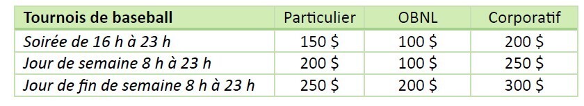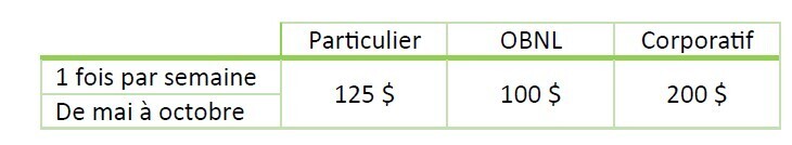 Les organismes à but non lucratif (OBNL) de Notre-Dame-de-Lourdes ont droit à un rabais de 15 % sur les tarifs indiqués.