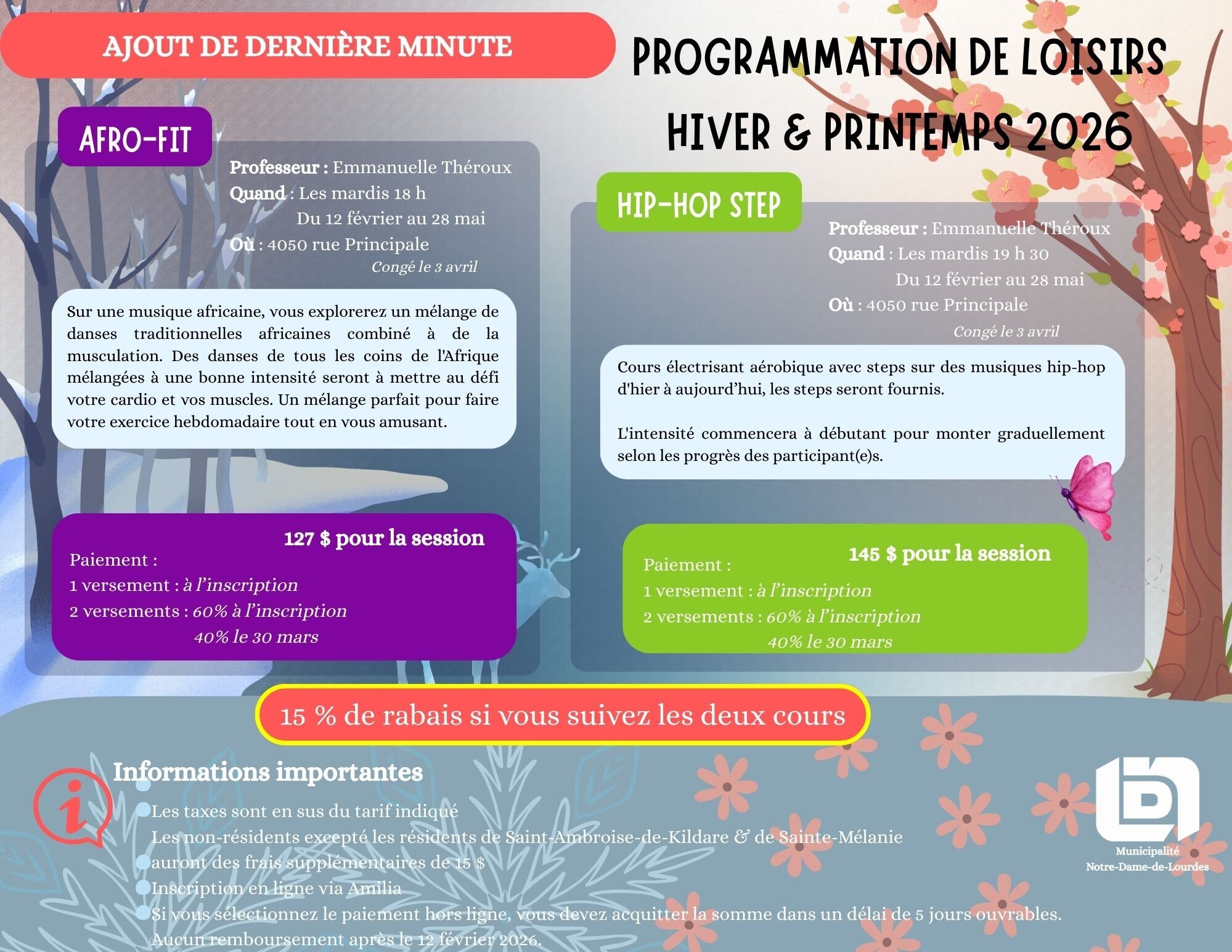 Causé par la très forte demande et le nombre de places limités, dorénavant les résidents de Notre-Dame-de-Lourdes seront priorisés pour la formation des groupes. De plus, vu l'entente de partenariat avec les municipalités de Saint-Ambroise-de-Kildare et de Sainte-Mélanie, ceux-ci seront également priorisés lors du processus d'inscription.